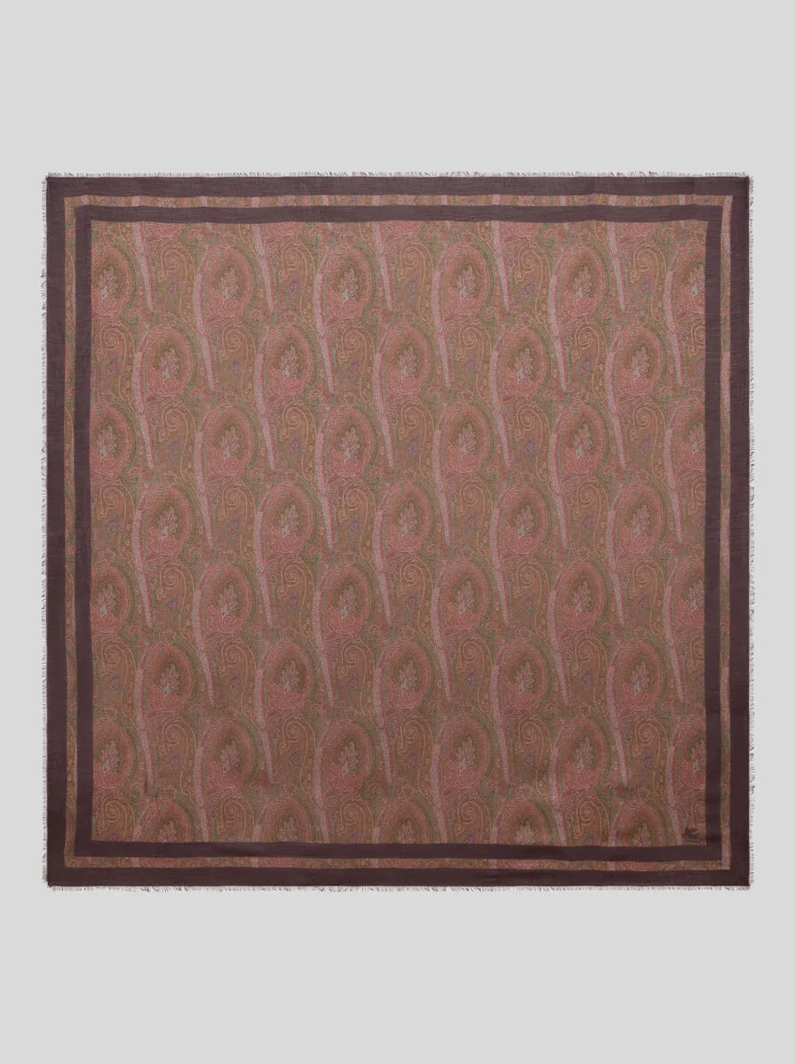Cashmere- and modal-blend shawl embellished with floral Paisley motif and contrasting plain-coloured double edge. Completing the design are slightly frayed short sides and a small contrasting detail with the Pegaso logo and ETRO monogram. • Size: 55.1 x 55.1 inches (140 x 140 cm) • Made in Italy PRODUCT DETAILS • 90% cashmere, 10% modal