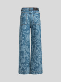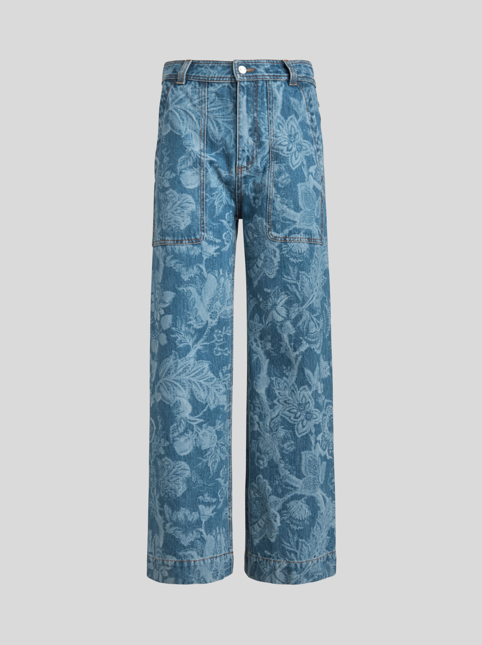 Cotton denim five-pocket jeans embellished by a contrasting placed floral print. PRODUCT DETAILS • 100% cotton • Regular fit • High waist • Five pockets • Metal button • Fastening with button and zip with flap • Label with ETRO logo with Pegaso embossed and applied to waist at rear • Made in Italy • The model is 178 cm tall and wears size 26 Sku: 221D1952195780200