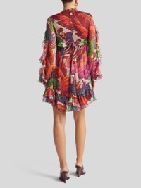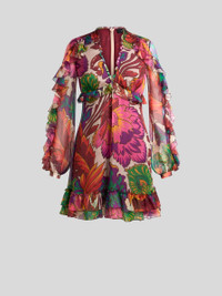 Mini dress in light silk crepon with multicoloured maxi floral print all over and skirt with voluminous double flounce at the bottom. The item stands out for its flowing shape and ruffles adorning the V-neck, long sleeves and bodice. The item was presented at the Spring-Summer 25 Women's Runway Show. • Regular fit • V-neck • Long sleeves with cuffs • Rear zip closure • Made in Italy • The model is 5' 9½" (177 cm) tall and wears a size 40 PRODUCT DETAILS • 100% silk • Lining: 100% polyester