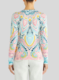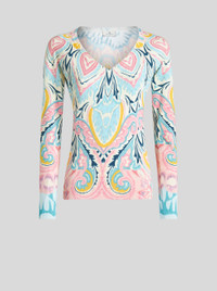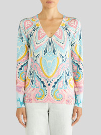 Stretch silk jumper with lucky clover floral patterns. PRODUCT DETAILS • 85% silk, 15% elastane • Slim fit • V neck • Long sleeves • Made in Italy • The model is 178 cm tall and wears size 40