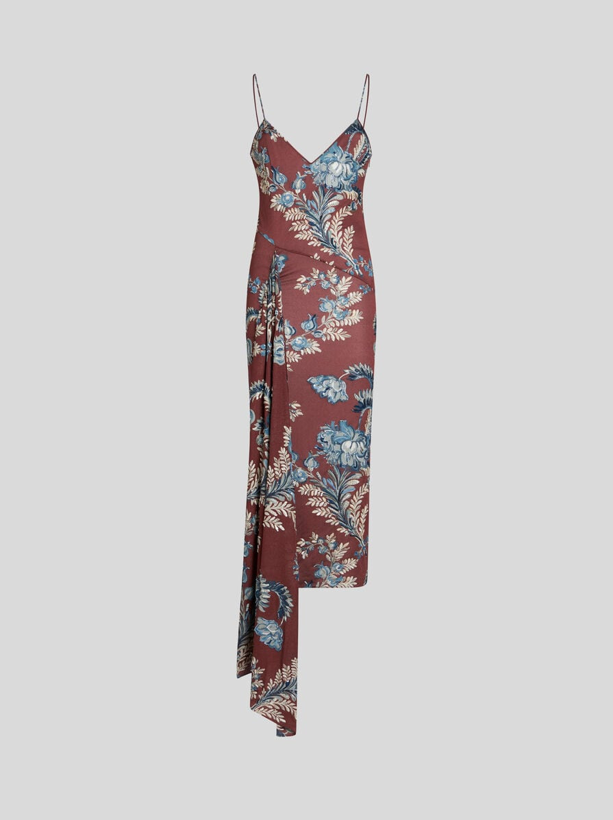 Crepe jersey midi dress with a floral foliage print and decorative sequin embellishment. • Slim fit • V-neck • Thin shoulder straps • Zip closure at the side • Made in Italy • The model is 5’10” (178 cm) tall and wears a size 40 (IT) PRODUCT DETAILS • 100% viscose • Lining: 100% viscose • Sequins: 100% polyester • Embroidery: 100% polyester