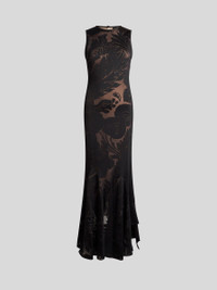 Slim-fitting, sleeveless long dress with asymmetric skirt. This item is made from stretch burnout jersey and boasts a see-through effect and maxi floral print all over. The item was presented at the Spring-Summer 25 Women's Runway Show. • Slim fit • Crewneck • Sleeveless • Asymmetric skirt • Button fastening on the back • Made in Italy • The model is 5' 9½" (177 cm) tall and wears a size 40 PRODUCT DETAILS • 62% viscose, 27% polyamide, 11% elastane • Lining: 100% viscose