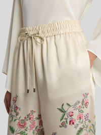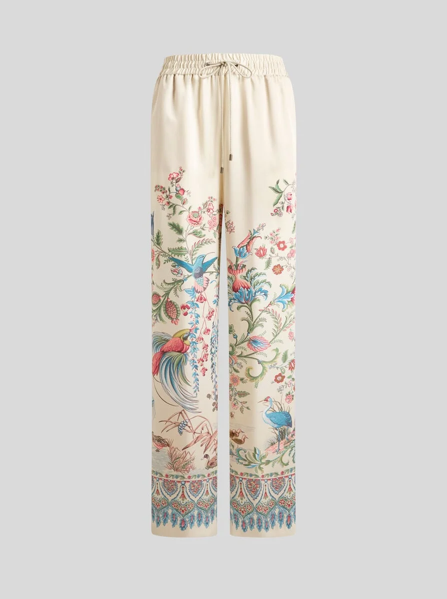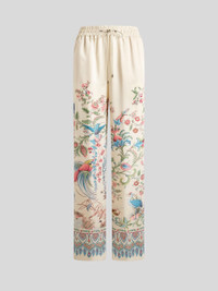 Wide-leg trousers in fluid twill fabric. The design is embellished with an all-over multicoloured motif inspired by natural flora and fauna and a placed print with floral and geometric elements along the hem. This pair is finished with an elasticated high waist with drawstring and a patch pocket on the back. • Regular fit • Elasticated high waist with drawstring • Welt side slip pockets • Patch pocket on the back • Made in Italy • The model is 5' 9½" (176 cm) tall and wears a size 40 PRODUCT DETAILS • 100% polyester