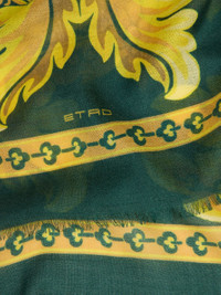 Cashmere-, wool- and silk-blend scarf featuring printed maxi flowers and small bees and edges embellished with a floral-style geometric micro pattern. This accessory, presented at the Autumn-Winter 25 Runway Show, is complete with slightly frayed short sides and the ETRO logo. • Size: 27.6 x 66.9 inches (70 x 170 cm) • Made in Italy PRODUCT DETAILS • 40% wool, 30% cashmere, 30% silk