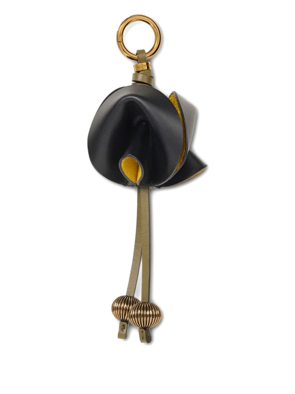 flower-shaped leather charm Highlights - Black - Flower shape - Leather construction - Yellow leather detail - Olive green leather straps - Gold-tone ribbed sphere embellishments Made in Italy Composition CALFSKIN 100% SIZE & FIT Measurement LENGTH 7.48 in(19 cm)