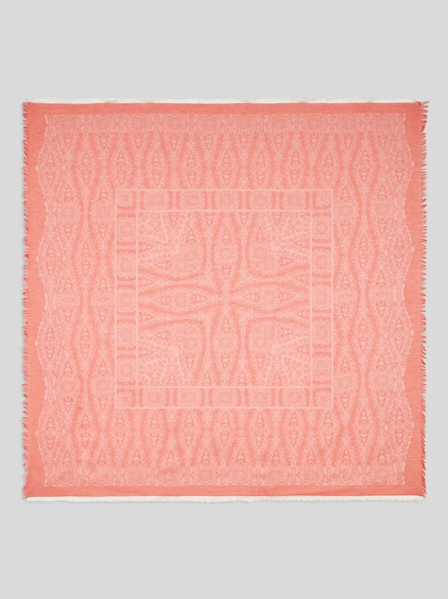 Cotton-blend shawl with medallion print and tonal micro Paisley jacquard motif. This accessory is complete with slightly frayed edges. • Size: 55.1 x 55.1 inches (140 x 140 cm) • Made in Italy PRODUCT DETAILS • 53% cotton, 47% modal
