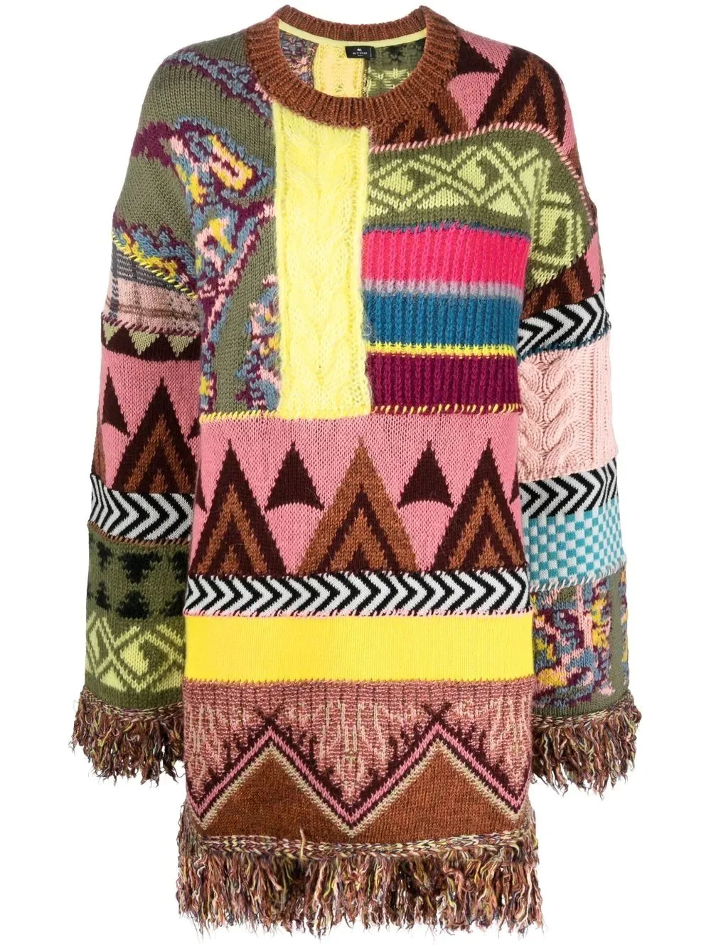 fringe-detail knitted dress Inspired by colour and creativity, ETRO adds its distinctive modern touch to this knitted dress. Decorated with an all-over abstract design, this dress is further elevated with fringe detailing for an eye-catching finish. Made in Italy Composition Wool 61%, Mohair 15%, Polyamide 9%, Acrylic 8%, Alpaca Wool 5%, Viscose 1%, Cashmere 1% SIZE & FIT Model measurements Height 5 ft 9 in(1.76 m) Bust/Chest 31.88 in(81 cm) Hips 35.43 in(90 cm) Waist 22.44 in(57 cm) FittingInformation This piece fits true to size. We recommend you get your regular size Cut for a loose fit Made with a mid-weight fabric Washing instructions Hand Wash