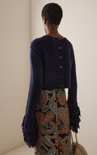 PRODUCT DETAILS - Slim fit, long sleeves, fringed cuffs, buttons down back - Sleeve length slightly shorter in production - Slips on - Composition: 82% Wool, 10% Alpaca, 6% Polyamide, 2% Acrylic - Professional Dry Clean - Fall '25 - Made In Italy