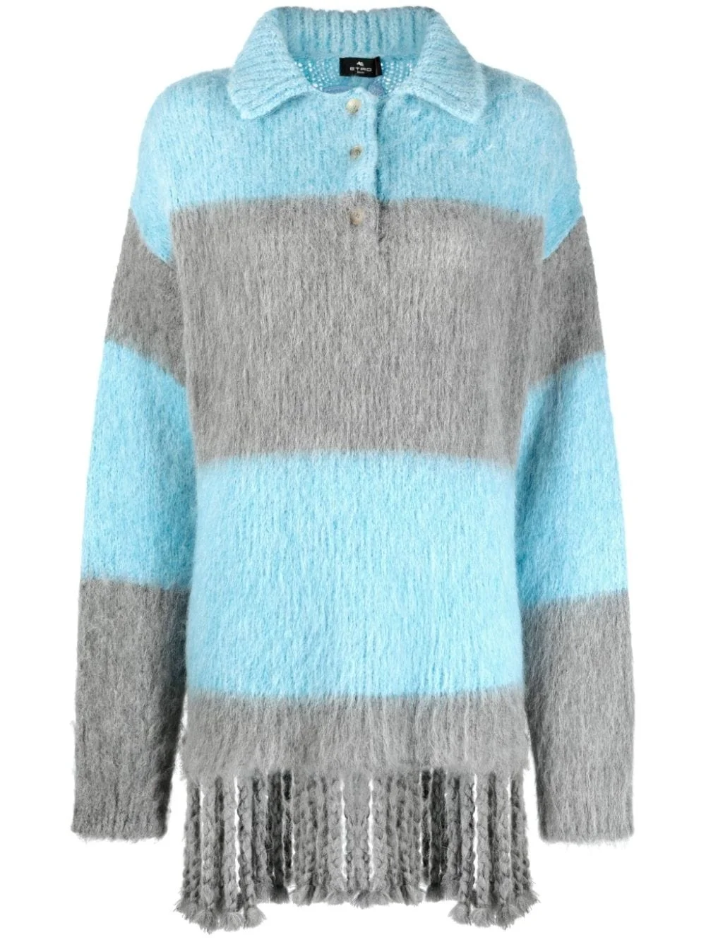 fringed-edge sweater minidress Highlights - Light blue/grey - Ribbed knit - Horizontal stripe pattern - Brushed effect - Signature pegaso motif - Embroidered logo to the rear - Polo collar - Front button placket - Long sleeves - Fringed edge Made in Italy Composition Acrylic 27%, Alpaca 24%, Mohair 22%, Polyamide 16%, Wool 11% SIZE & FIT Model measurements Height 5 ft 10 in(1.79 m) Bust/Chest 33.07 in(84 cm) Hips 35.82 in(91 cm) Waist 24.01 in(61 cm) Washing instructions Dry Clean Only