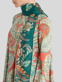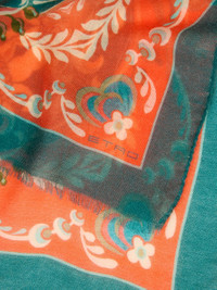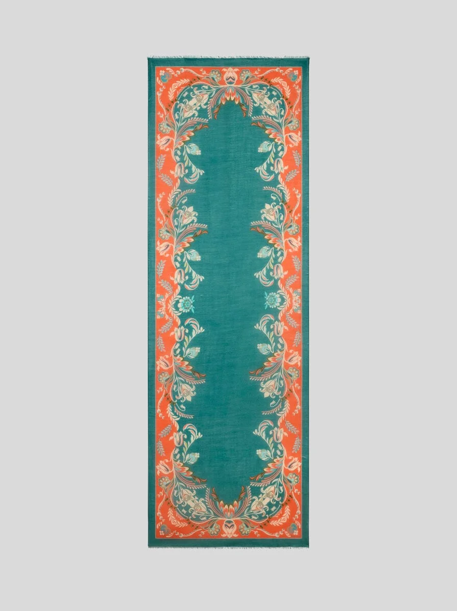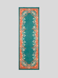 Wool- and cashmere-blend scarf featuring contrasting edging with decorative daffodil motif. This accessory, presented at the Autumn-Winter 25 Runway Show, is complete with slightly frayed short sides and the ETRO logo in the corner. • Size: 27.6 x 78.7 inches (70 x 200 cm) • Made in Italy PRODUCT DETAILS • 90% wool, 10% cashmere