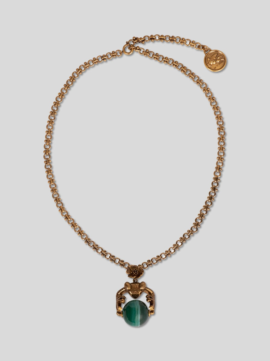 Brass chain necklace with vintage-effect golden finish. This accessory is enhanced by a frog-shaped crystal-ball pendant and a charm featuring a raised Pegaso logo. • Clasp closure • Made in Italy PRODUCT DETAILS • 100% brass • Appliques: 100% silicone
