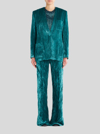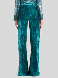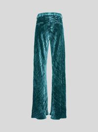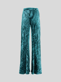 Flared silk froissé velvet trousers from the Women's Fall-Winter 2022 fashion show collection. PRODUCT DETAILS • 80% viscose, 20% silk • Regular fit • Hook and hidden zip fastening • Side pockets • Piped rear pockets • Made in Italy • The model is 178 cm tall and wears size 40 Sku: 222D1320005760250