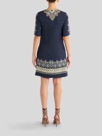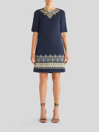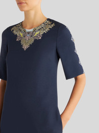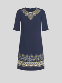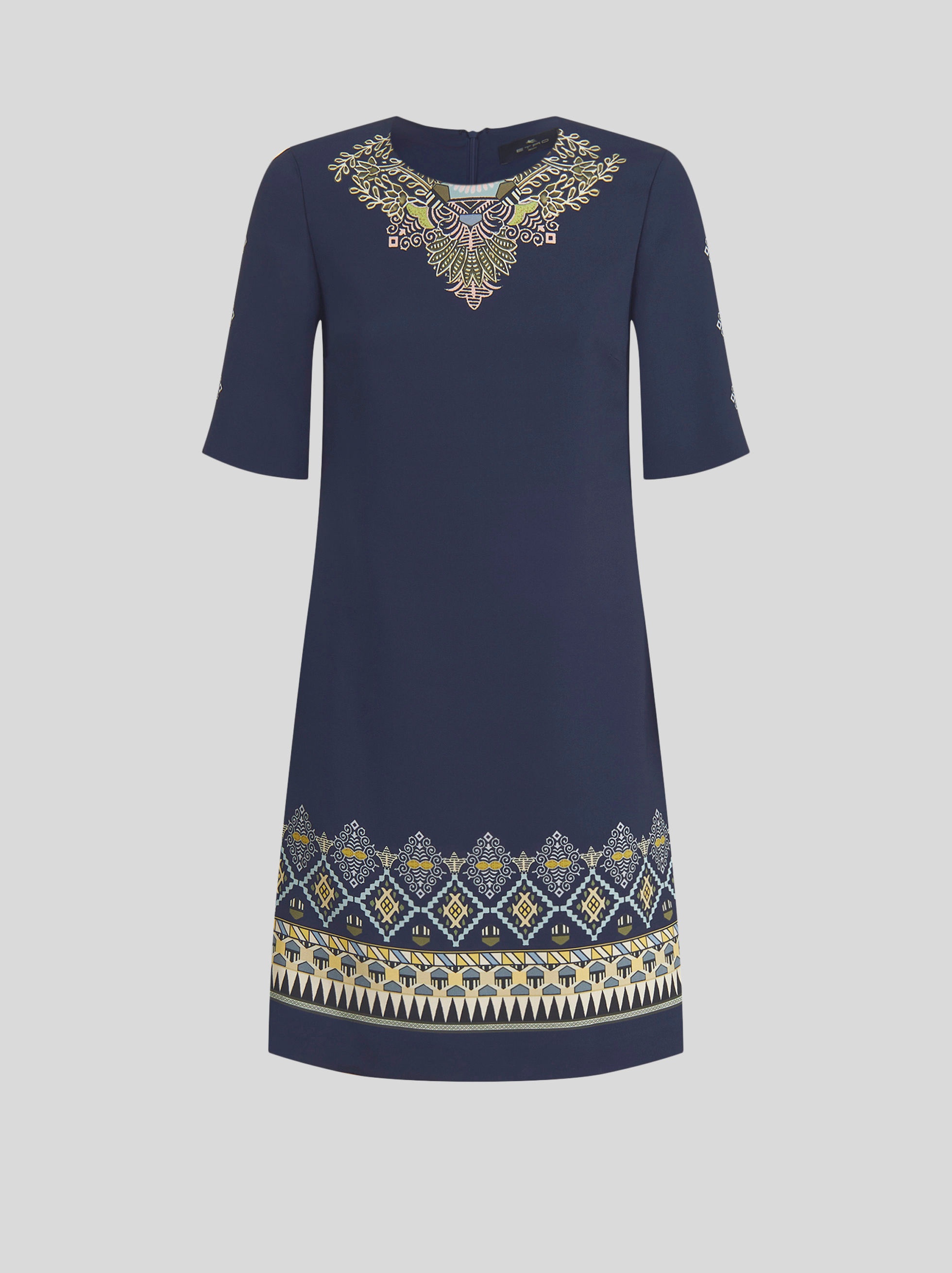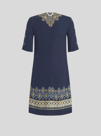 Viscose tunic dress with placed ornamental floral patterns and decorative geometric designs at the bottom. PRODUCT DETAILS • 95% viscose, 5% elastane • Lining: 57% viscose, 43% polyester • Regular fit • Round neck • Short sleeves • Rear zip fastening • Made in Italy • The model is 178 cm tall and wears size 40