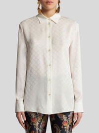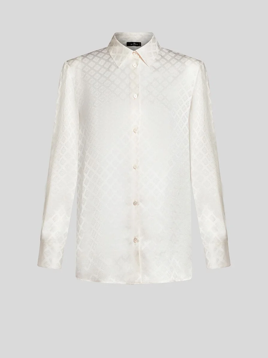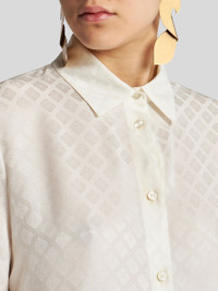 Straight-cut, relaxed-fit shirt. This model is made from silk-blend jacquard crepe de chine with a tone-on-tone geometric motif all over. • Regular fit • Spread collar • Long sleeves • Working cuffs • Button closure • Made in Italy • The model is 5’10” (178 cm) tall and wears a size 40 (IT) PRODUCT DETAILS • 50% silk, 50% viscose