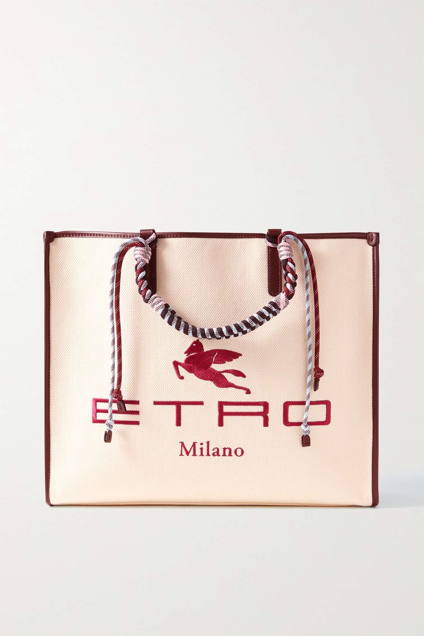 EDITORS'NOTES Etro's 'Globetrotter' tote has enough space inside to carry everything you need for the day - it even has a zipped pocket for your phone or keys. Made from cream canvas and trimmed with leather, it's embroidered with the brand's signature 'Pegasus' logo and moniker in a plum hue. The handles are long enough to carry comfortably over your shoulder. DETAILS & CARE - Cream canvas, dark-brown leather (Calf) - Open top - Comes with dust bag - Weighs approximately 1.8lbs/ 0.8kg