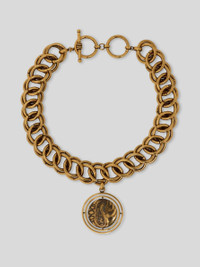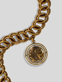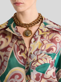 Vintage short necklace with chain and button-shaped pendant, featuring engraved Paisley and floral details. The accessory was presented at the Women's Autumn-Winter 25 Runway Show. • Length: 18.1 inches (46 cm) • Pendant: 2 x 2 inches (5 x 5 cm) • T-bar closure • Made in Italy PRODUCT DETAILS • Body: 100% brass • Chain: 100% brass