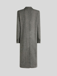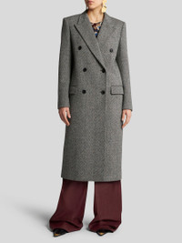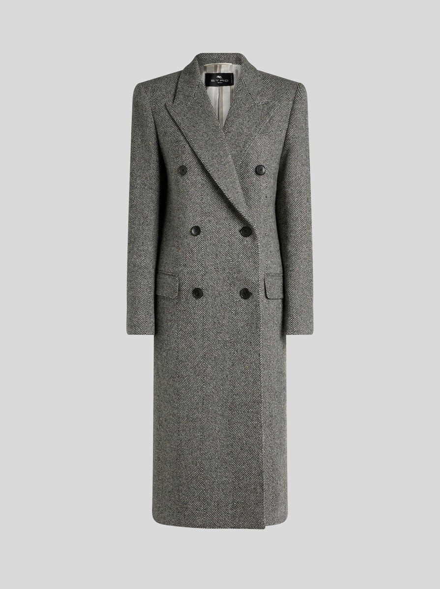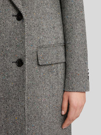 Double-breasted wool tweed coat with chevron motif. This model features a lapel collar. The inner lining features a decorative striped pattern. PRODUCT DETAILS • 80% wool, 20% nylon • Lining: 52% viscose, 48% acetate