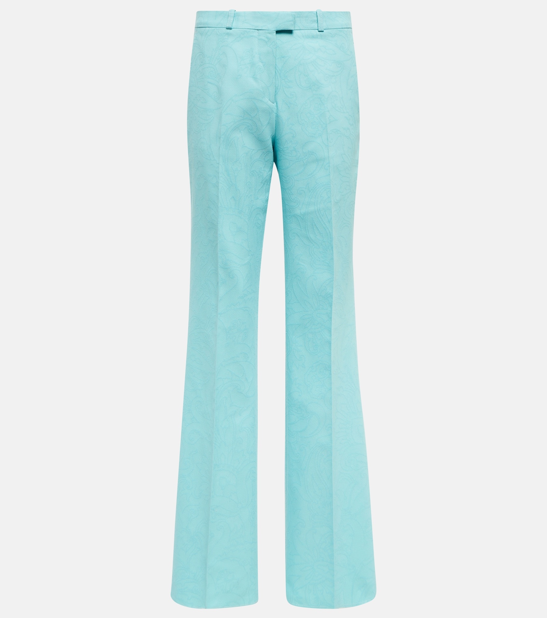 Build your warm-weather workwear edit with these vibrant pants from Etro. The bright design is made from a stretchy cotton blend, falls high on the hips, and features a silhouette with straight legs. Product Details - Closure: zipper fly, button and hook fastenings - Made in Italy - Material: 64% cotton, 1% elastane, 11% polyamide, 24% viscose - Designer color name: 1 - Pockets: side slit pockets, back pockets - Care instructions: dry clean - Item number: P00759556 Size & Fit - Fits large to size - we recommend trying one size smaller - Straight leg - High-rise - Unhemmed for tailoring - The model seen in the picture is 178cm-5'10" and wearing a size IT 38