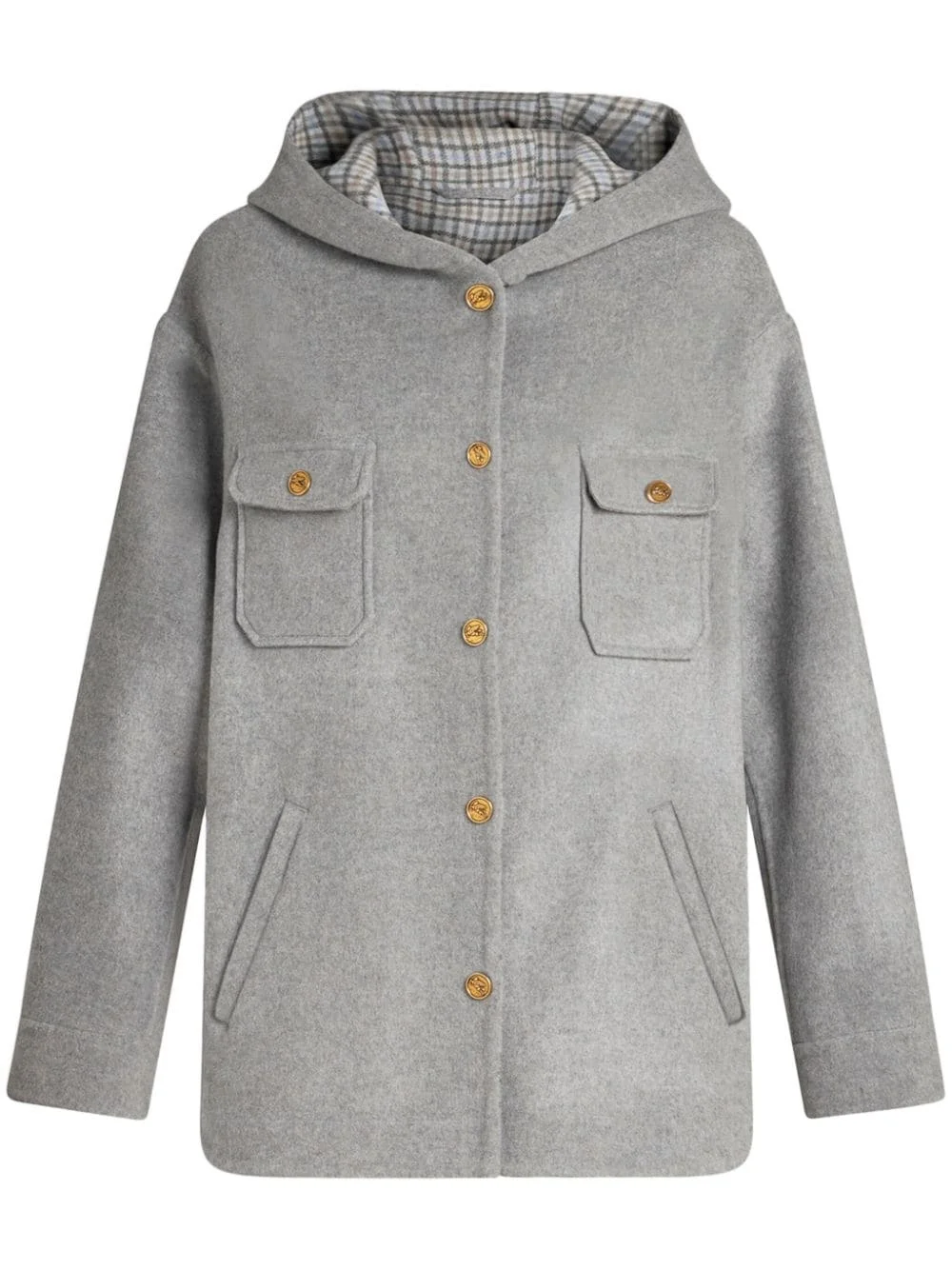 hooded cashmere jacket Highlights - Grey - Wool/cashmere - Logo-engraved buttons - Classic hood - Front button fastening - Two chest flap pockets - Two front welt pockets Imported Composition Wool 80%, Cashmere 20%