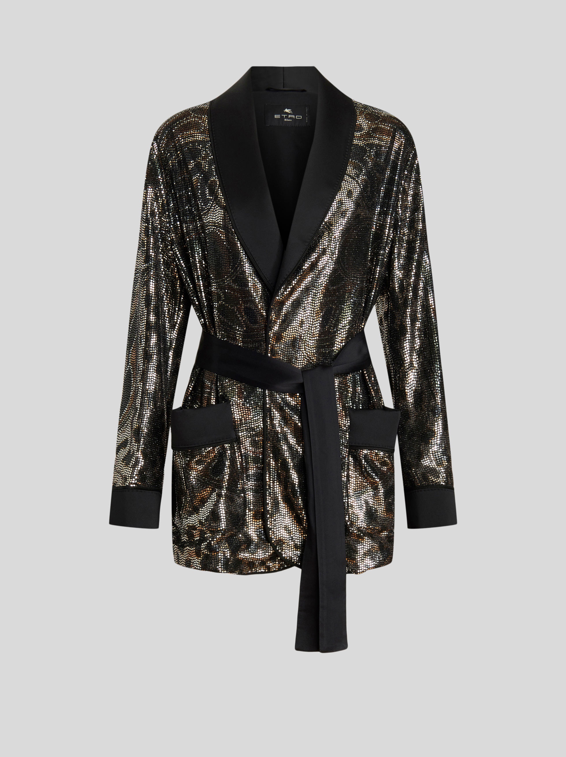 Robe style jacket with micro sequins and a Paisley print. PRODUCT DETAILS • Patterned fabric: 87% nylon, 8% polyester, 5% elastane • Solid colour fabric: 71% viscose, 29% silk • Sequins: 100% polyester • Regular fit • Solid colour shawl lapel • Fastening with co-ordinated belt • Patch side pockets • Made in Italy