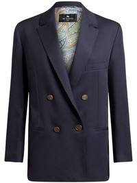 double-breasted blazer Highlights - Navy blue - Double-breasted button fastening - Chest welt pocket - Two front jetted pockets - Buttoned cuffs Made in Italy Composition Cotton 98%, Spandex/Elastane 2% SIZE & FIT FittingInformation Designed to be unstructured, offering a loose fit throughout The internal shoulder pads offer a structured shape Made from a midweight stretch fabric, this piece offers elasticity and flexibility when worn