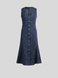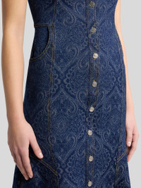 Sleeveless midi dress in faded cotton denim with slight stretch, embellished with abstract jacquard motif. This item fastens with metal buttons embellished with a raised Pegaso logo. • Regular fit • Square neckline • Sleeveless • Side slip pockets • Patch pockets on the back • Fastened with Pegaso buttons • Made in Italy • The model is 5' 9½" (177 cm) tall and wears a size 40 PRODUCT DETAILS • 98% cotton, 2% elastane