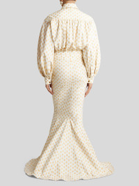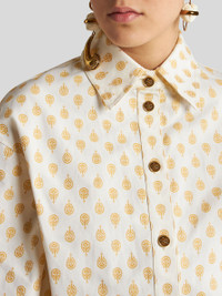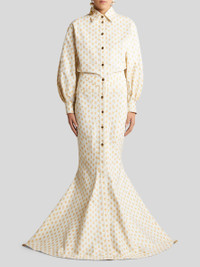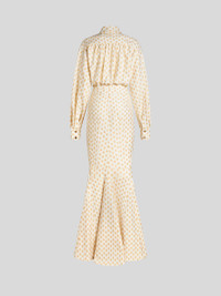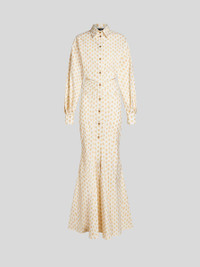 Maxi shirt dress in Oxford cotton jacquard with Flower Tye motif all over. This model boasts a structured, mermaid-like silhouette that is snug at the sides and has a train at the back. Features wide sleeves fastened at the cuff. Metal buttons with a raised Pegaso symbol and an embroidered ETRO logo on the back. PRODUCT DETAILS • 100% cotton