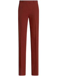 jacquard straight-leg tailored trousers These burnt-orange ETRO trousers draw from the creative director’s worldly travels and the brand’s rich archives. They’re tailored to a straight-leg silhouette and woven with a mosaic pattern inspired by 18th-centry brocades. Highlights - Brick red - Virgin wool blend - Patterned jacquard - Pressed crease - Belt loops - Concealed front fastening - Mid-rise - Straight leg - Tailored cut - Two side inset pockets - Two rear button-fastening jetted pockets Made in Italy Composition Virgin Wool 98%, Elastane 2% Washing instructions Read Manufacturer Guidelines