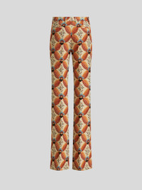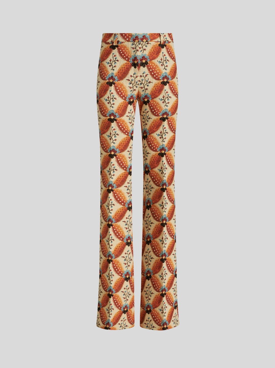Flared trousers in jacquard fabric decorated by floral geometric patterns. PRODUCT DETAILS • 51% cotton, 37% polyester, 12% acrylic • Slim fit • Piped pockets • Button and zip fastening • Made in Italy • The model is 178 cm / 70 inches tall and wears size 40