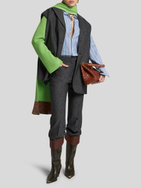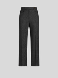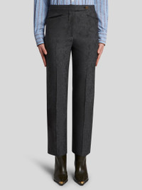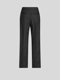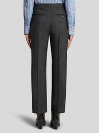 Wool trousers with a slightly flared hem featuring an all-over jacquard design. This piece is enhanced by metal buttons with a raised Pegaso logo. Features a pressed crease. PRODUCT DETAILS • 100% wool