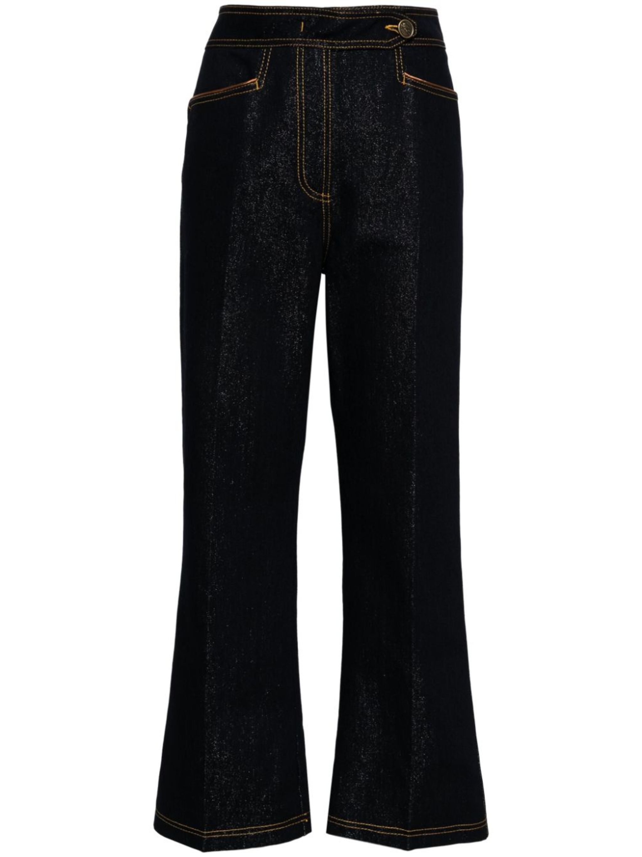 indigo blue cotton blend denim metallic threading contrast stitching concealed front button, hook and zip fastening logo-embossed buttons signature Pegaso motif pressed crease straight leg cropped two side slit pockets two rear button-fastening jetted pockets Size & Fit Model Measurements: Height: 1.76 m Bust/Chest: 83.0 cm Hips: 90.0 cm Waist: 62.0 cm Model wears size 27 Fabric and Care Designer Style ID: WRNB0017AD177 Designer Colour: S9000 BLUE Composition: Metallic fibre 10%, Viscose 20%, Cotton 70%, Polyester 100% Washing instructions: Dry Clean Only Made in Italy