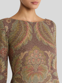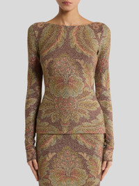 Slim-fit sweater in terry jersey fabric with lurex and decorative all-over floral print. This model features a boat neck at the front and a plunging U-neckline at the back. The item was presented at the Autumn-Winter 25 Runway Show. • Fitted • Boat neck • U-neckline at the back • Long sleeves • Made in Italy • The model is 5' 9½" (176 cm) tall and wears a size 40 PRODUCT DETAILS • 65% polyamide, 30% polyester, 5% elastane