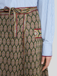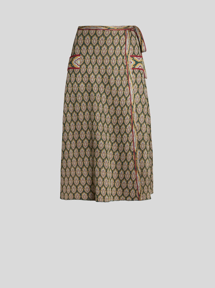 Wraparound midi skirt in knit viscose-blend jacquard fabric with tie-style motif all over. PRODUCT DETAILS • 75% viscose, 25% polyester