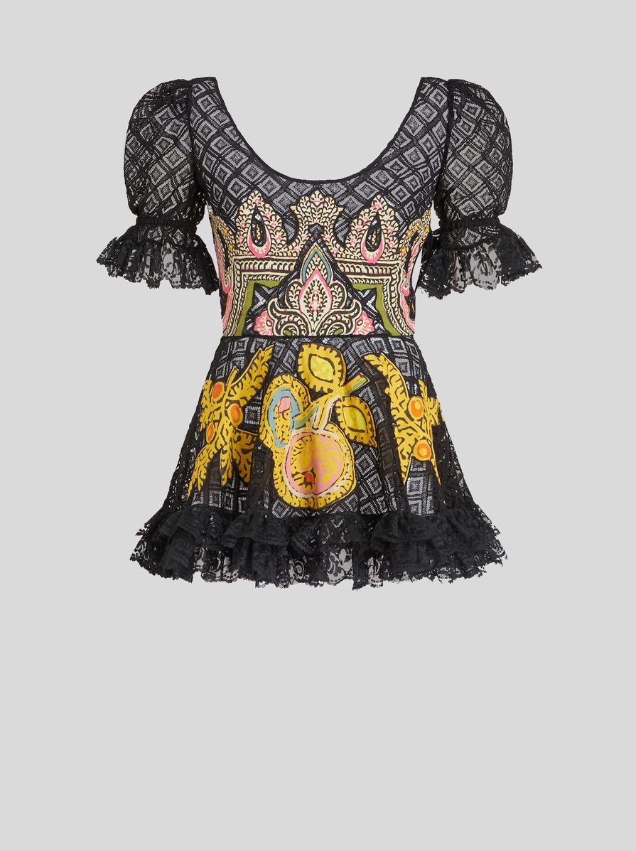 Mini dress in lace from the Spring-Summer 2023 Fashion Show collection featuring ruches and decorated with apples and birds and a printed Paisley border. PRODUCT DETAILS • Exterior: 54% polyamide, 46% cotton • Printed fabric: 100% polyester • Regular fit • Round neck • Short balloon sleeves • Side zip fastening • Made in Italy • The model is 178 cm tall and wears size 40