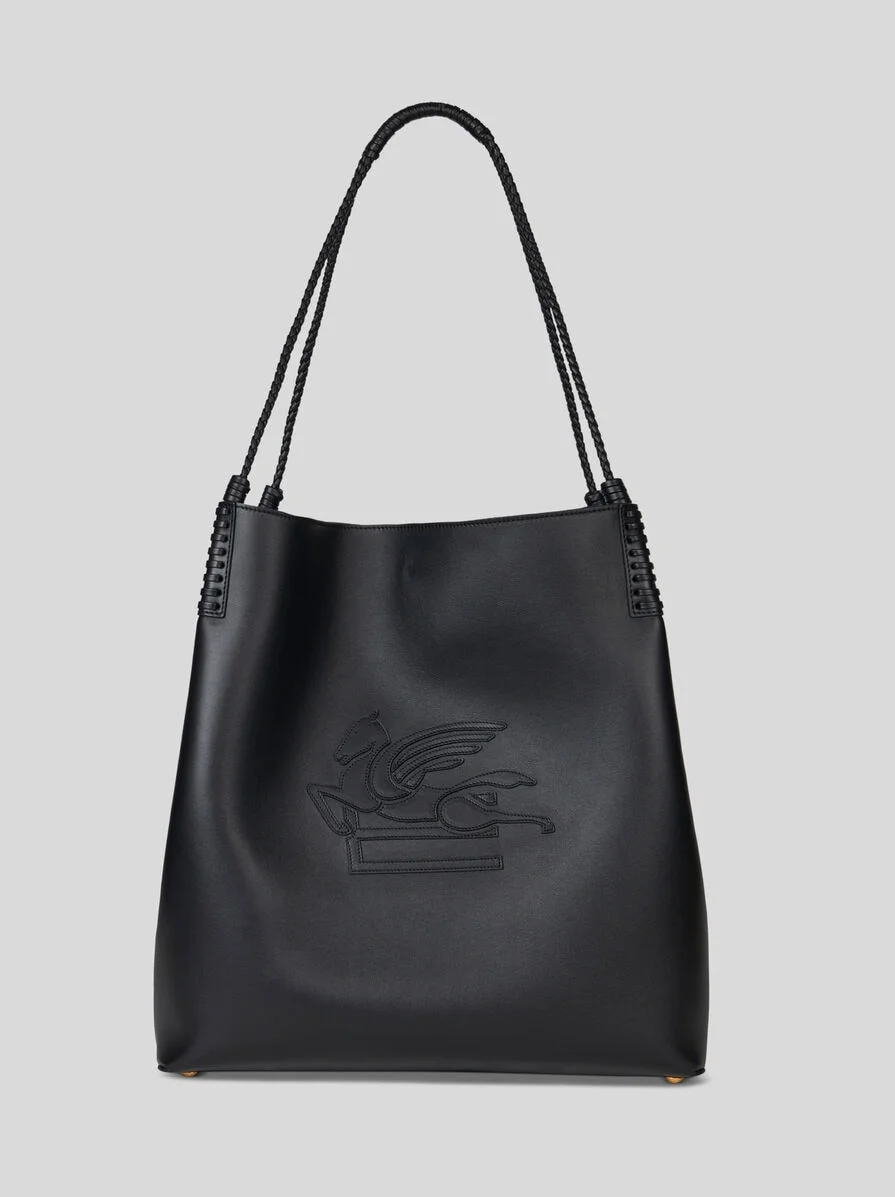 Large Libra leather tote bag embellished with an embroidered patch featuring the ETRO logo and Pegaso symbol on the front. Braided handles and threading on the corners of the bag. Suede interior and clasp closure. This accessory features a convenient suede clutch inside. • Size: 37.5 x 38.5 x 14 cm • Clasp closure • Two handles • Metal feet • Made in Italy PRODUCT DETAILS • 100% leather