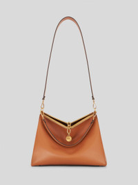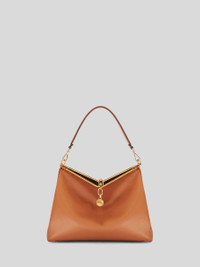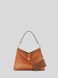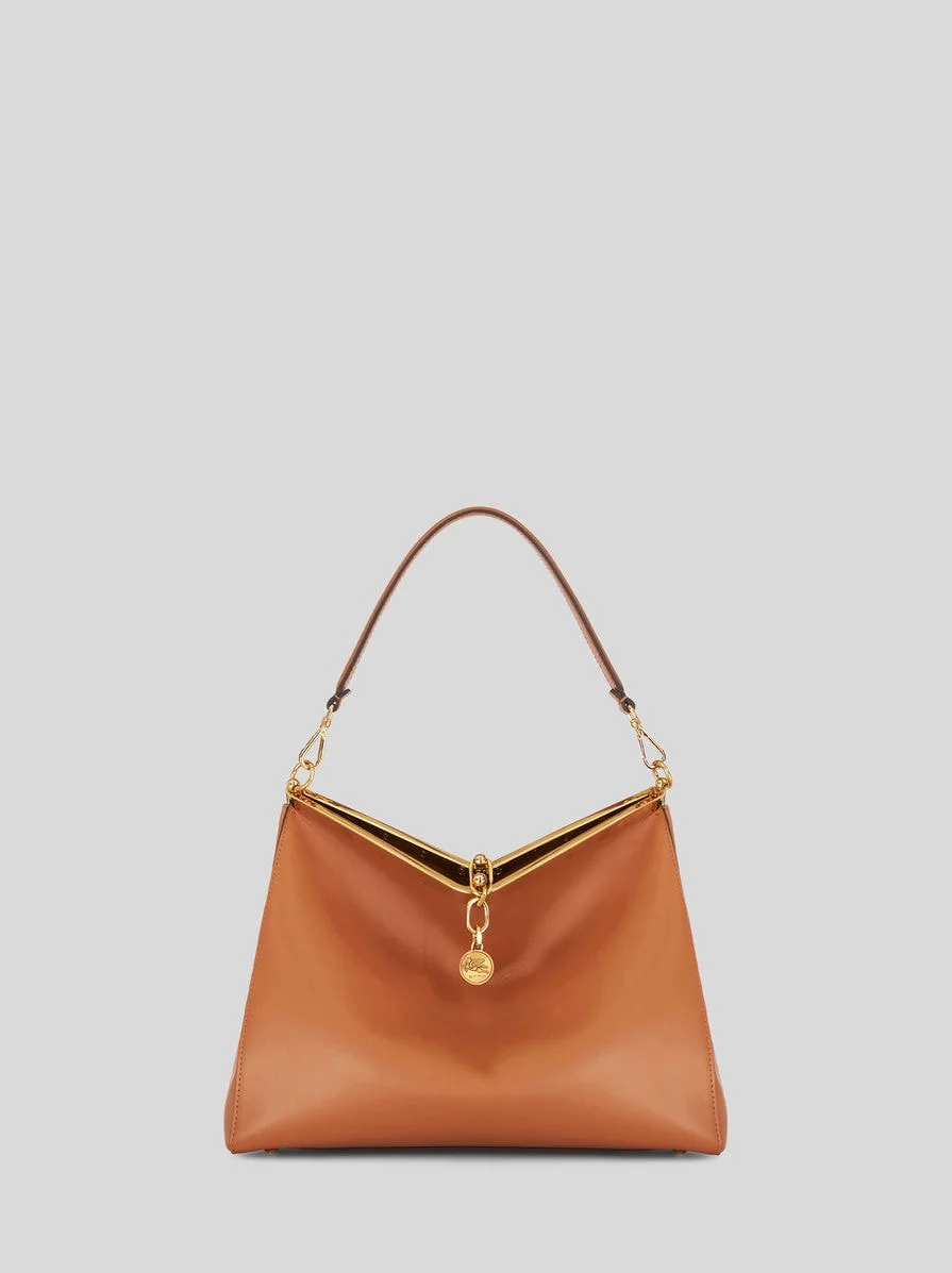 Large leather Vela bag from the Women's Fall-Winter 2023 Fashion Show collection featuring a metal fastening with chain embellished by a medal with ETRO and Pegaso logo. The bag has a suede pouch inside and is perfect to be worn as a shoulder bag or as a crossbody bag. PRODUCT DETAILS • 13.38 x 10.23 x 5.51 inches (34 x 26 x 14 cm) • Exterior: 100% calfskin • Interior: 100% calfskin • Short shoulder strap length (drop) 27 cm / 10.62 inches • Long shoulder strap length (drop) 50 cm / 19.68 inches • Metal feet • Gold-finish metal accessories • Made in Italy
