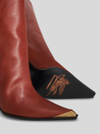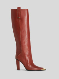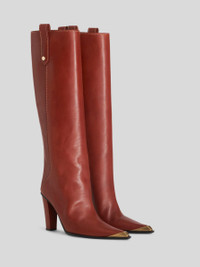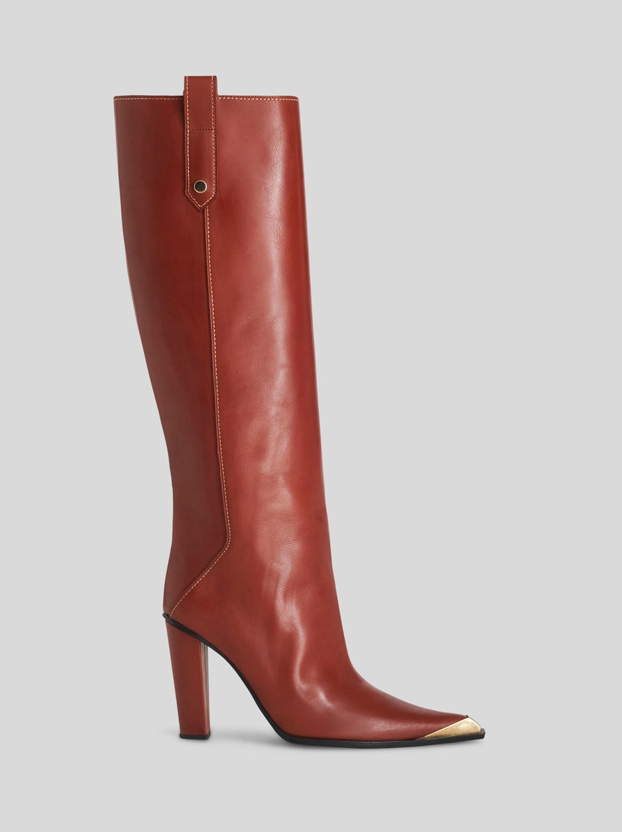 Leather tube boots with solid heel and tapered toe embellished with metal detail. This model is customised with a printed ETRO logo and Pegaso symbol on the sole. PRODUCT DETAILS • Upper: 100% leather • Lining: 100% leather • Sole: 100% leather • Heel height: 10 cm / 3.93 inches • Made in Italy