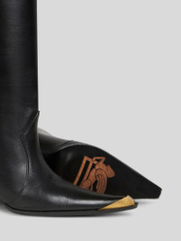 Leather cowboy boots with tapered toe embellished with metal detail. This model is customised with a printed ETRO logo and Pegaso symbol on the sole. • Heel height: 2.36 inches (6 cm) • Made in Italy PRODUCT DETAILS • Upper: 100% leather • Lining: 100% leather • Sole: 100% leather • Applique: 100% brass