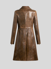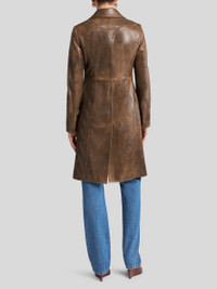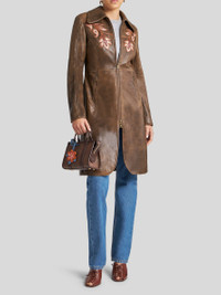 Knee-length coat made from soft leather with worn effect. This model features two decorative floral-style inlays on the chest. • Slim fit • Pointed collar • Zip closure • Side slip pockets with zip • Zipped cuffs • Made in Italy • The model is 5' 9½" (177 cm) tall and wears a size 40 PRODUCT DETAILS • 100% calfskin • Lining: 52% viscose, 48% acetate