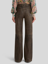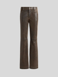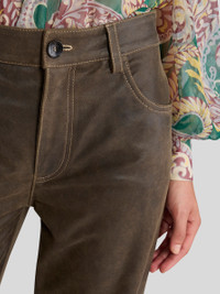 Regular-fit five-pocket trousers in soft leather. These are finished with contrasting stitching. The item was presented at the Autumn-Winter 25 Runway Show. • Regular fit • Regular rise • Five pockets • Button and zip closure • Belt loops • Made in Italy • The model is 5' 9½" (176 cm) tall and wears a size 40 PRODUCT DETAILS • Calfskin • Lining: 57% viscose, 43% polyester