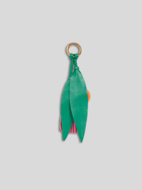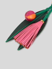 Charm consisting of leather ball, tassel and leaves, and complete with a golden clasp ring with knotted leather. The accessory was presented at the Spring-Summer 25 Women's Runway Show. PRODUCT DETAILS • Lambskin