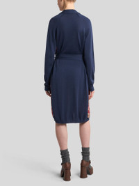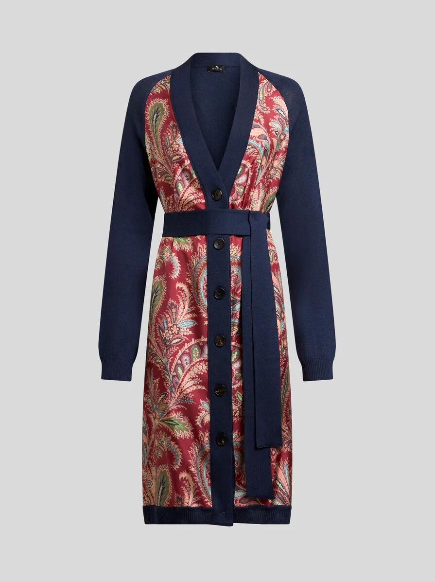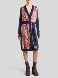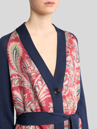 Long cardigan in knit cotton-blend fabric. This item features a silk twill front panel embellished with a floral Paisley print and is complete with a matching belt that ties into a knot. • Regular fit • V-neck • Button closure • Matching waist belt • Ribbed edging • Made in Italy • The model is 5' 9½" (177 cm) tall and wears a size 40 PRODUCT DETAILS • Printed fabric: 100% silk • Knit fabric: 60% cotton, 40% viscose