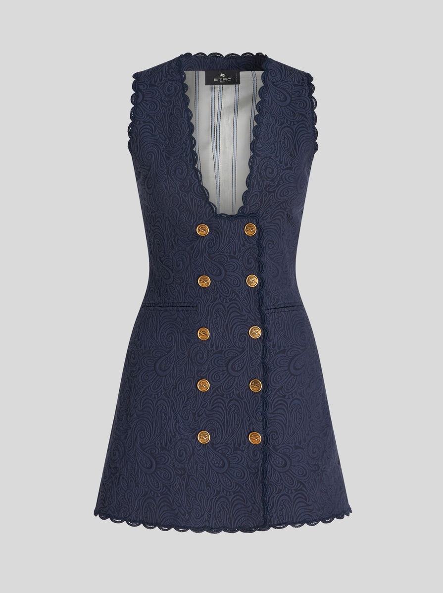 Long double-breasted waistcoat in stretch cotton-blend jacquard with tone-on-tone Paisley motif all over. This slim-fit piece features scalloped trims adorning the hems and metal buttons with a raised Pegaso logo. PRODUCT DETAILS • 64% cotton, 35% viscose, 1% elastane • Hems: 90% cotton, 10% polyester • Lining: 52% viscose, 48% acetate • Slim fit • V-neck • Double-breasted closure • Metal buttons with raised Pegaso logo • Welt side slip pockets • Made in Italy • The model is 178 cm/ 70.07 inches tall and wears a size 40 (IT)