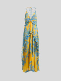 Long dress with spaghetti straps that cross at the back. This pleated garment is enhanced by ruffles and a contrasting, placed floral print. • Plunging V-neck • Spaghetti straps that cross at the back • Made in Italy • The model is 5' 9½" (177 cm) tall and wears a size 40 PRODUCT DETAILS • 100% polyester • Lining: 100% polyester
