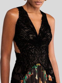 Boho-style long dress with slim-fitting lace bodice, which is longer at the back and boasts a see-through effect. This sleeveless garment with plunging V-neck, inspired by a piece presented at the Spring-Summer 25 Women's Runway Show, is enhanced by a skirt in light silk crepon with voluminous flounce, all-over floral print and train. At the rear, the criss-crossing spaghetti straps leave part of the back open. PRODUCT DETAILS • 100% silk • Lace: 81% polyamide, 19% cotton • Lining: 100% polyester