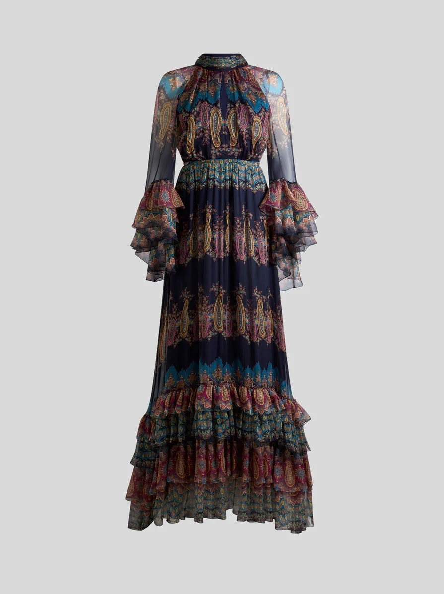 Long dress in lightweight silk crepon with decorative, placed Paisley print with floral detailing. This item stands out for its high neck with front opening and long silk scarf. The long sleeves with see-through effect are enhanced by flounces, which also appear at the bottom of the skirt. • Fit-and-flare fit • High neck with silk scarf • Long sleeves with flounce detail • Rear zip closure • Made in Italy • The model is 5' 9½" (177 cm) tall and wears a size 40 PRODUCT DETAILS • 100% silk • Lining: 100% polyester