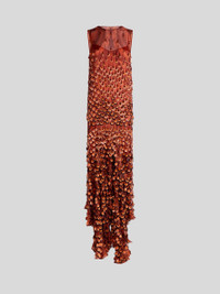 Sleeveless long dress in soft silk organza, featuring an asymmetric skirt with flounces at the bottom. This model, sporting an all-over floral print, is covered in shiny sequins accompanied by hand-embroidered beads that intensify at the bottom. The item was presented at the Autumn-Winter 25 Runway Show. • Regular fit • Crewneck • Sleeveless • Made in Italy • The model is 5' 9½" (176 cm) tall and wears a size 40 PRODUCT DETAILS • 100% silk • Embellishment: PVC and glass • Lining: 100% polyester