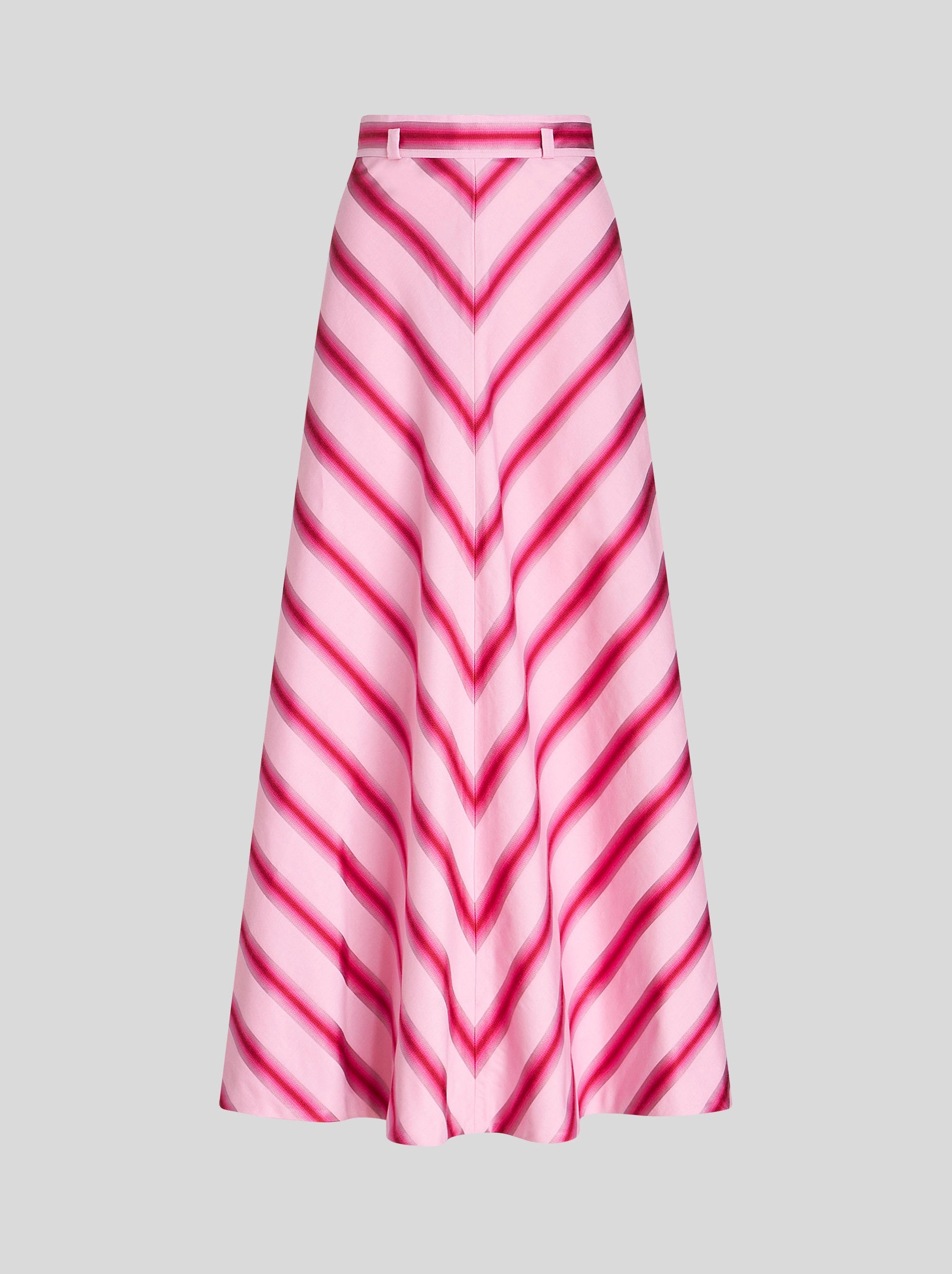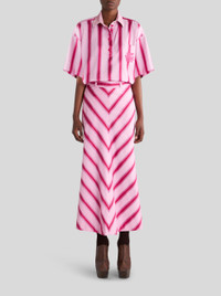 Long cotton and silk skirt from the Spring-Summer 2023 Fashion Show collection featuring stripes with degradé colour. PRODUCT DETAILS • 69% cotton, 31% silk • Lining: 100% cotton • High waist • Rear button and hidden zip fastening • Varnished horn button with ETRO logo • Made in Italy • The model is 178 cm tall and wears size 40