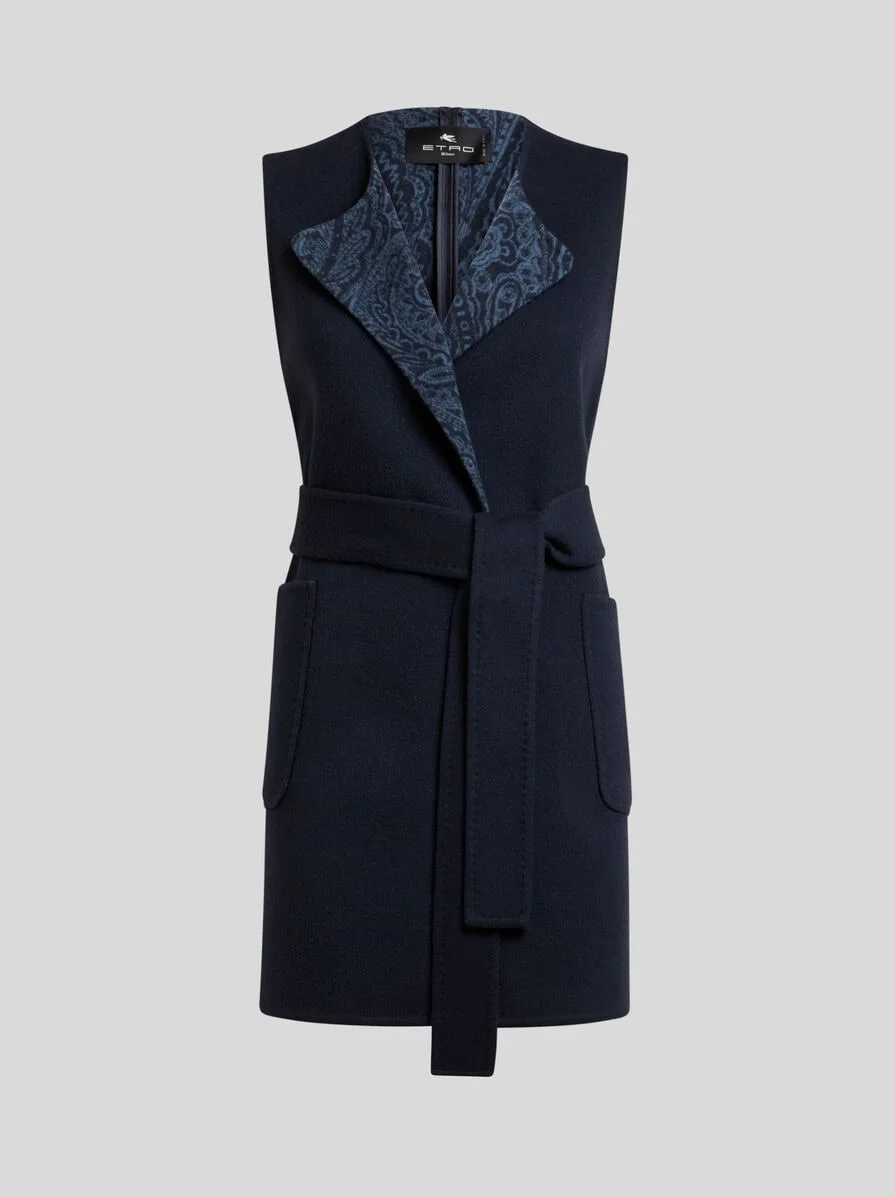 Long waistcoat in plain-coloured, double-layered wool- and cashmere-blend cloth. It features contrasting lapels sporting a Paisley jacquard motif and a belt that ties into a knot. • Regular fit • Fastened with detachable belt • Patch pockets on the front • Side splits • Made in Italy • The model is 5' 9½" (177 cm) tall and wears a size 40 PRODUCT DETAILS • 92% wool, 7% cashmere, 1% polyamide