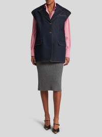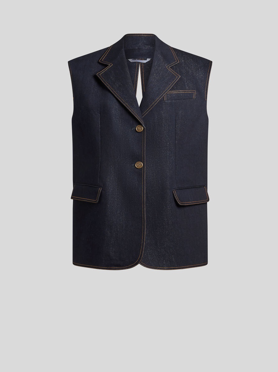 Lurex and cotton-blend denim vest embellished with metal buttons with a raised Pegaso detail. This model is distinguished by the maxi-slit on the back. PRODUCT DETAILS • 70% cotton, 20% viscose, 10% metallic fibres • Lining: 52% viscose, 48% acetate